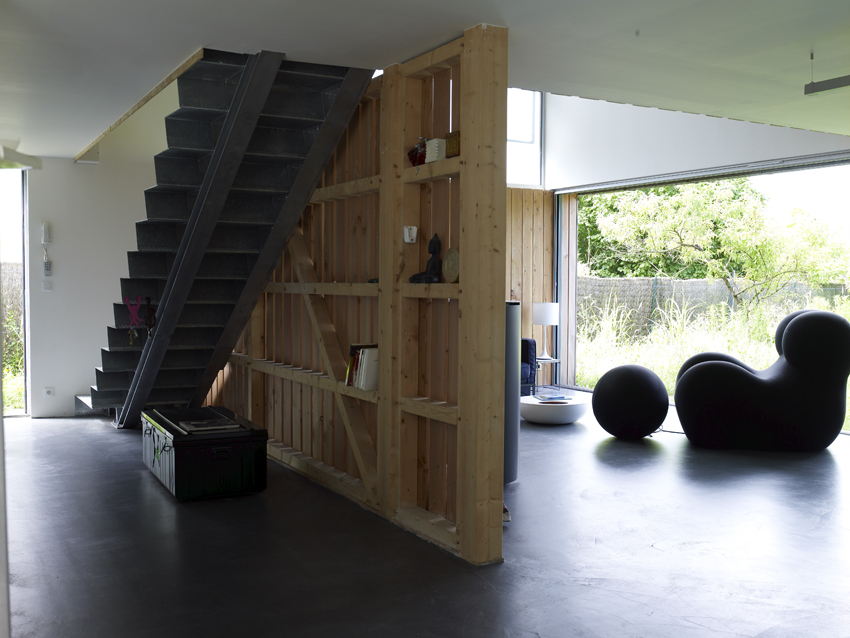 Illustration parfaite de la « structure habitée » : le Magic Kub. En position centrale de la maison, des voiles intérieurs de contreventement, revêtues des rebuts du bardage extérieur (zéro déchet), partitionnent l’espace, vues et lumière. Huit panneaux préfabriqués en ateliers et deux jours de montage plus tard, le Magic Kub était né.
